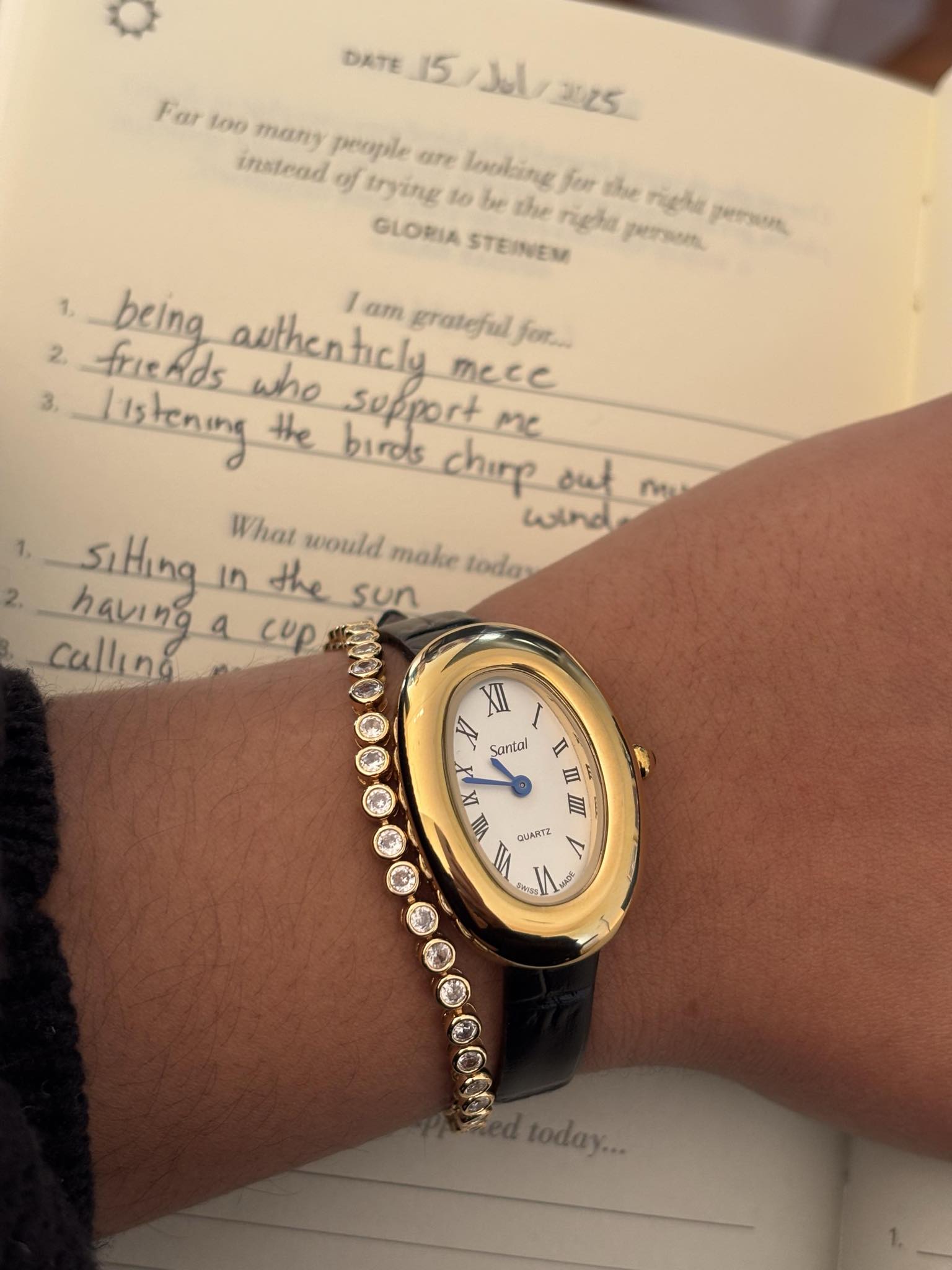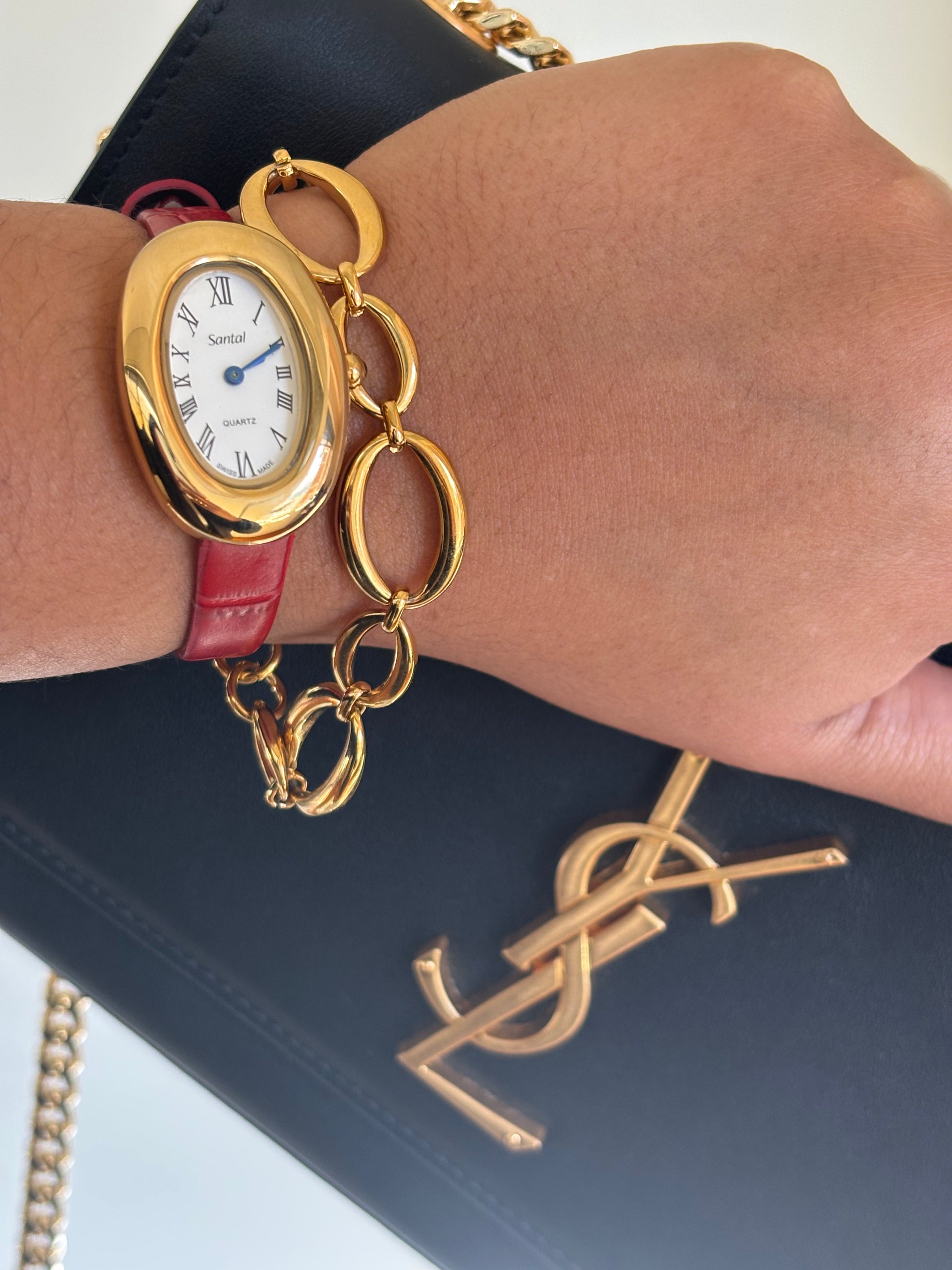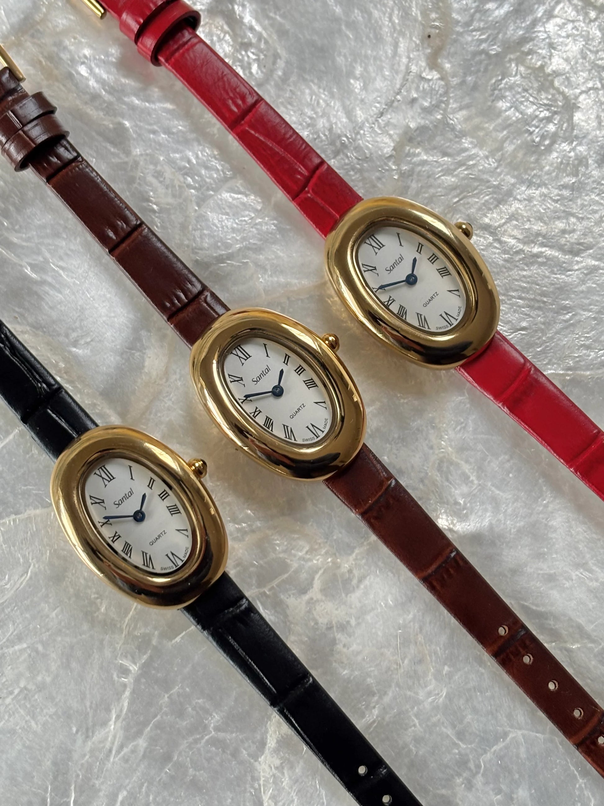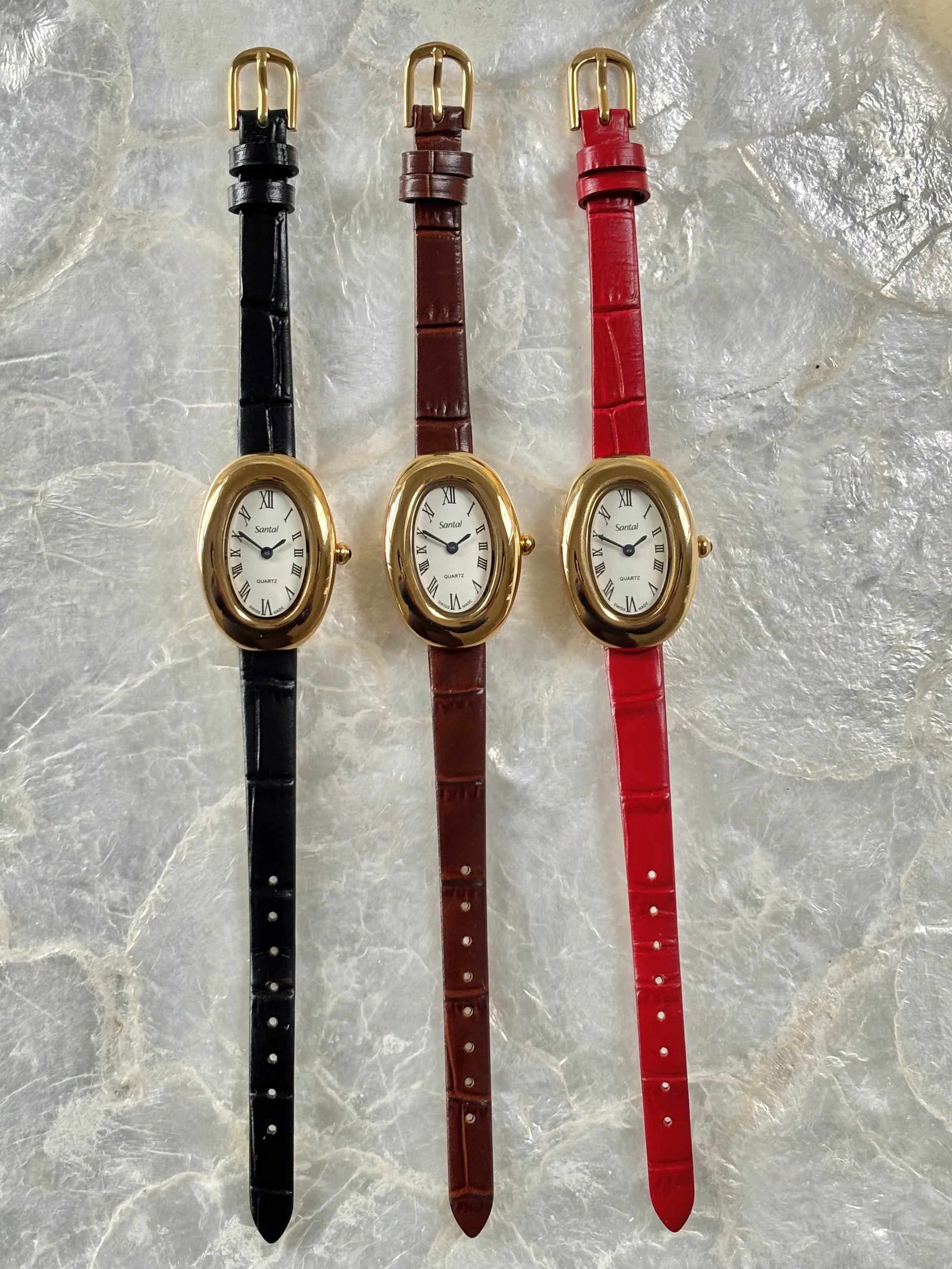 Our first collection of watches. Santal N.1 showcases a polished, gold-toned oval case paired with a clean white dial, featuring Roman numerals and slender black hands for a refined, minimalist look. Complemented by crocodile-textured leather straps in black, chocolate brown, and vibrant red, these watches are designed to suit every styleβwhether classic, bold, or timelessly chic