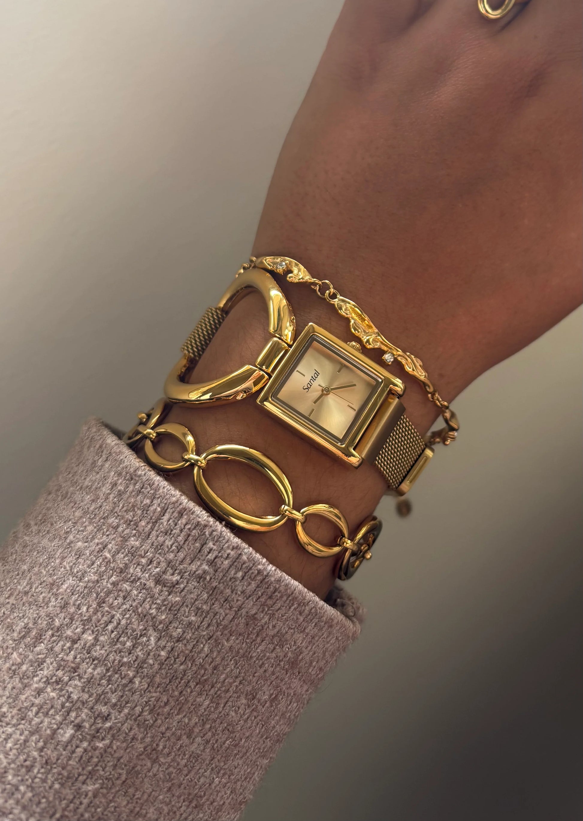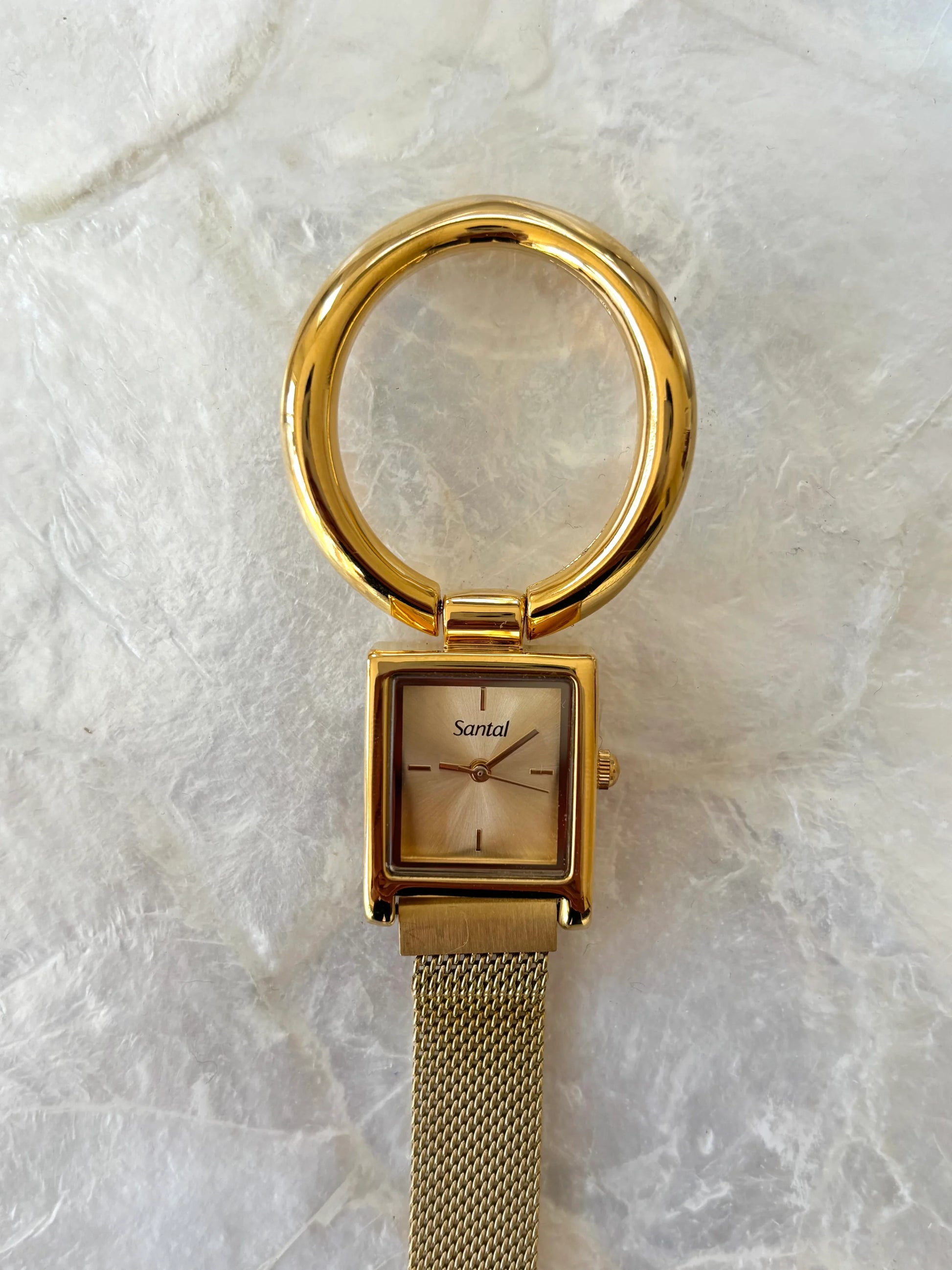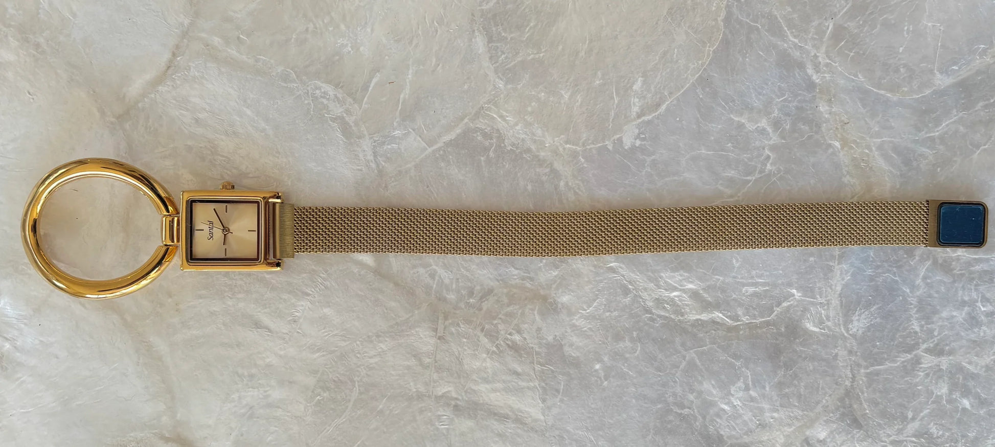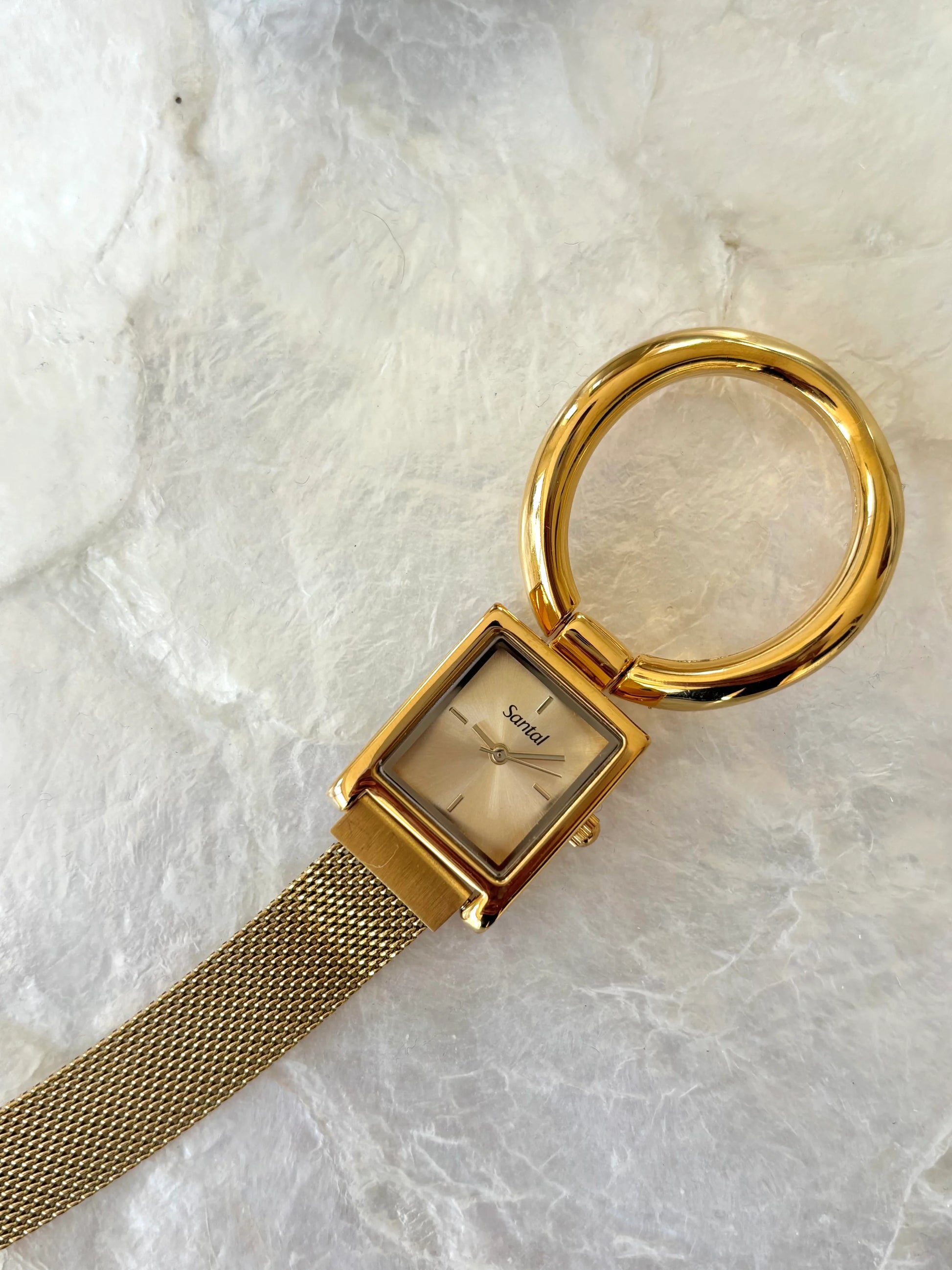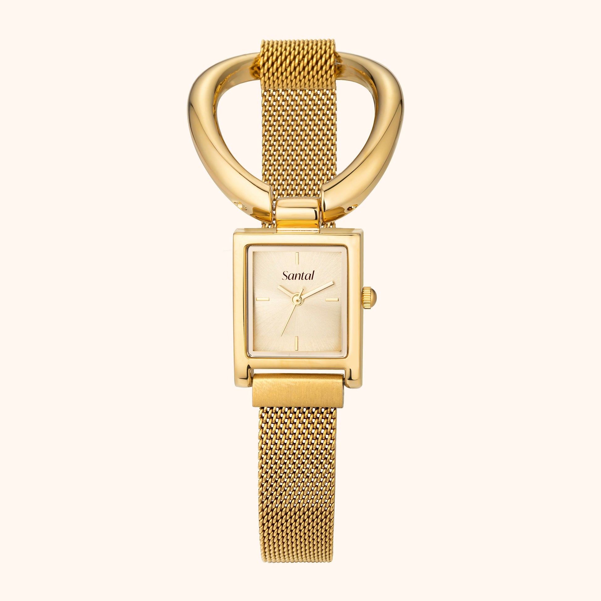 Santal N.2 is a modern and elegant timepiece, thoughtfully designed for a perfect fit with its adjustable magnetic mesh band. The band gracefully wraps around the wrist, secured by a sophisticated golden loop positioned above the dial.